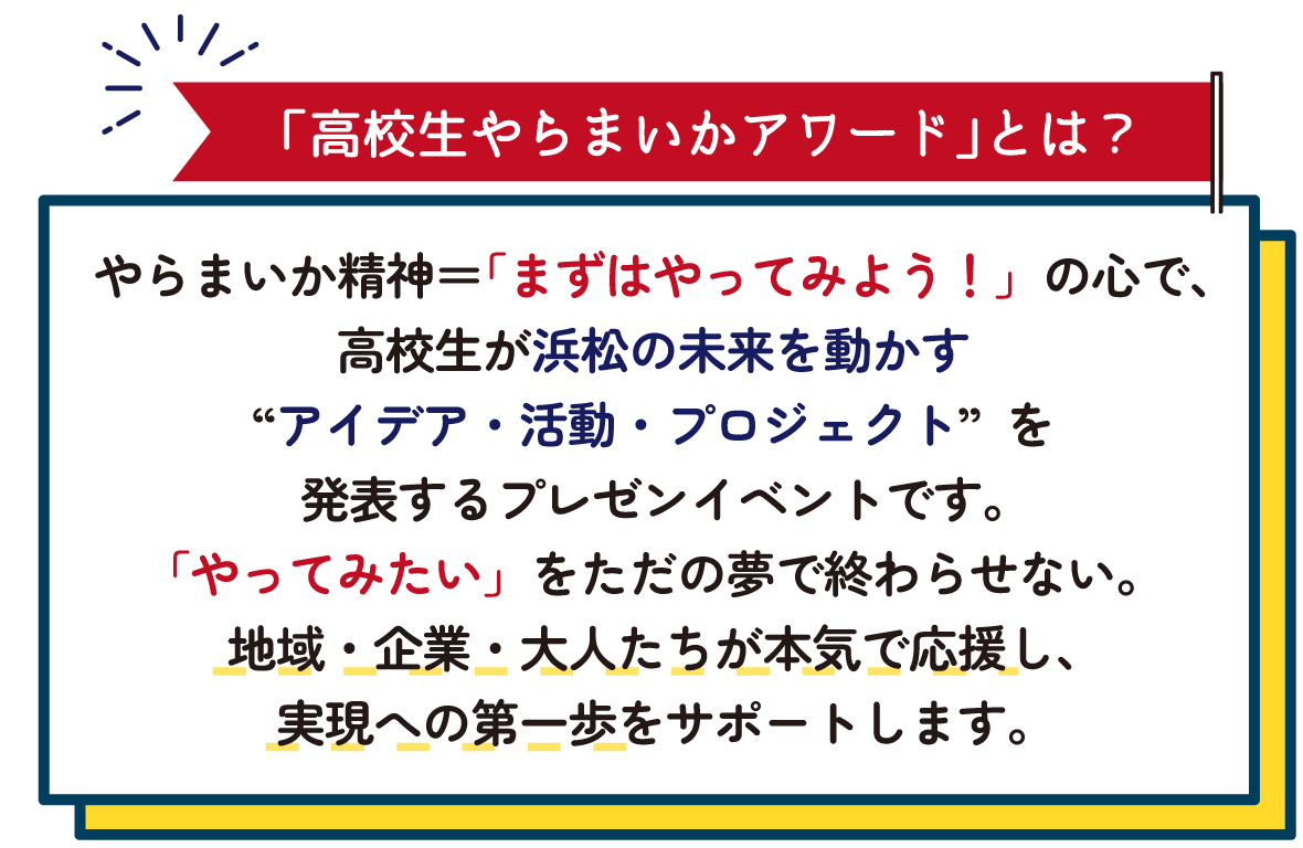 今回の「高校生やらまいかアワード」は、単なるプレゼン大会ではありません。夢やアイデアを語る舞台を、音楽や照明で彩るエンタメフェスのようなイベントを企画しております。高校生一人ひとりの「やってみたい!」を、街のみんなが本気で応援する。観る人にも「自分も何か始めたい」と火をつけるような体験型イベントを目指しております。
